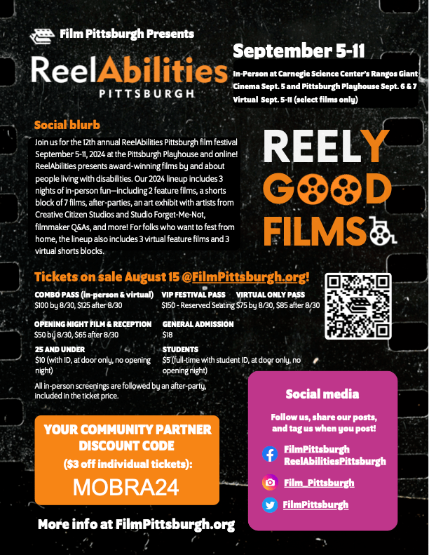 Join us for the 12th annual ReelAbilities Pittsburgh film festival September 5-11, 2024 at the Pittsburgh Playhouse and online! ReelAbilities presents award-winning films by and about people living with disabilities. Our 2024 lineup includes 3 nights of in-person fun – including 2 feature films, a shorts block of 7 films, after-parties, an art exhibit with artists from Creative Citizen Studios and Studio Forget-Me-Not, filmmaker Q&As, and more! For folks who want to fest from home, the lineup also includes 3 virtual feature films and 3 virtual shorts blocks.